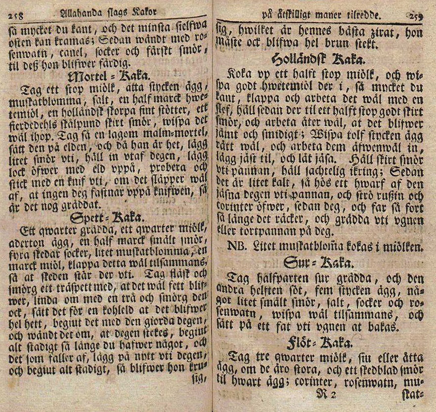 I first learned of this recipe from Kurtos dot EU, like many other things on this site. The cookbook is named En Nödig och Nyttig Hus-Hålds och Kok-Bok (A Necessary and Useful House- and Cook-book), by Susanna Eger. It was published in 1737 in Stockholm, in typical blackletter Swedish.